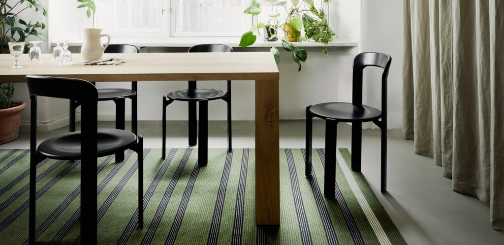 Når det kommer til et tæppe under spisebordet, er funktion mindst lige så vigtig som stilen. Hvis tæppet er for lille, hænger stolenes ben fast i kanten og får tæppet til at bule. Regn altid med 65 cm ekstra, så der er plads til at trække stole ud.
